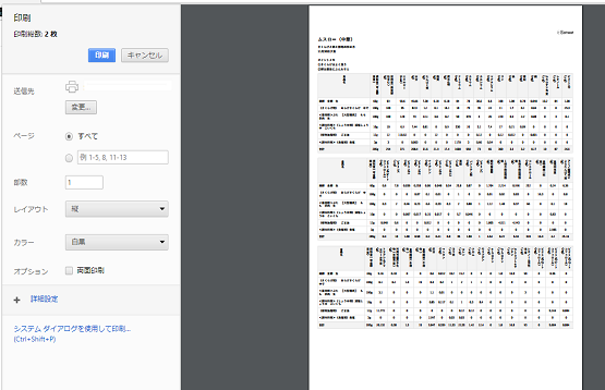 印刷をしたい時には、上の項目のとおり印刷用画面を開いた後、画面下部の印刷ボタンを押してください。ブラウザの印刷プレビュー画面が表示されますので、あとは通常のWebサイトの印刷と同じように印刷できます。