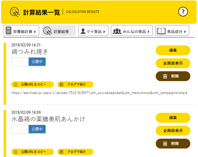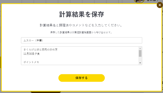 保存した計算結果一覧は栄養価計算機内上部にある「計算結果」ボタンを押すと表示されます。