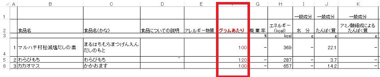 登録した食品の「グラムあたり」は赤文字で表示されます。