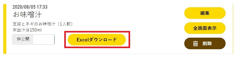 登録したマイ食品を一括または、マイ食品ごとにExcelシートにダウンロードできます。