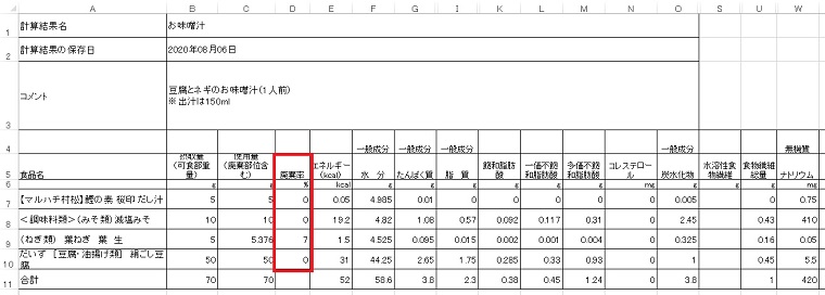 Excelシートには、「計算結果名」、「計算結果の保存日」、「コメント」、「計算結果」が表示されます。また、摂取量と使用量から廃棄率が算出され、自動的に入力されます。