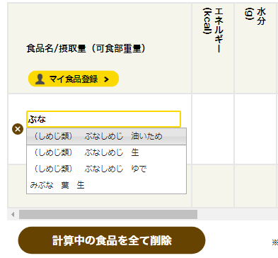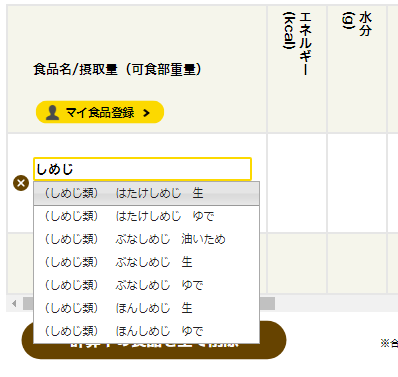 例えば、しめじについての栄養価・栄養成分詳細を確認したい時は、検索窓に「しめじ」と入れると、各種しめじの検索結果が表示され、確認したいものをクリックすると、