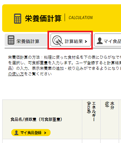 計算結果の保存は、ログインした状態でないと使えずデータが消えてしまうため、保存機能を使う場合には栄養価計算を始める前にログインしておく(会員登録がまだの方は、会員登録をしておく)必要があります。