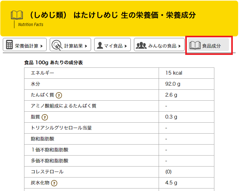各食品の栄養価・栄養成分詳細を個別に確認したい時