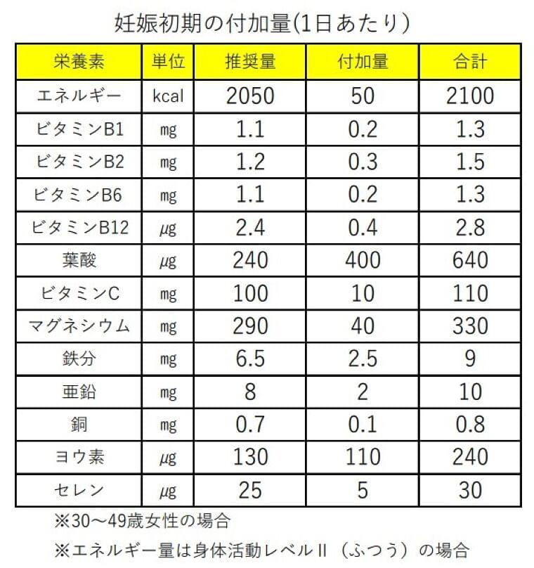 妊娠中はビタミンやミネラルが不足しないように、食事の質を高めてバランスを整えることが重要です。さらに妊娠初期は、葉酸を食事から240㎍、サプリメントから400㎍摂取することが推奨されています。それ以外の栄養素は、付加量を考慮する前に必要量に過不足がないよう食事のバランスを整えることを優先させるとよいでしょう。