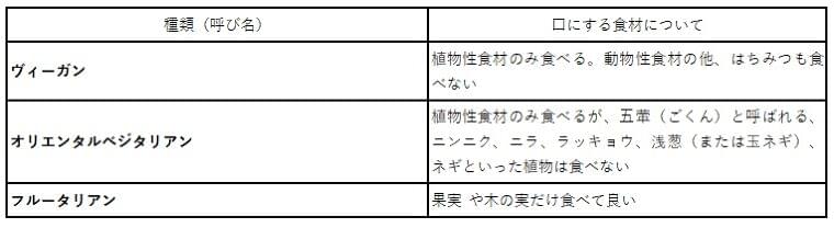 ベジタリアンの中には、一部の動物性食材を食べる人もいるなど、その種類はさまざまです。