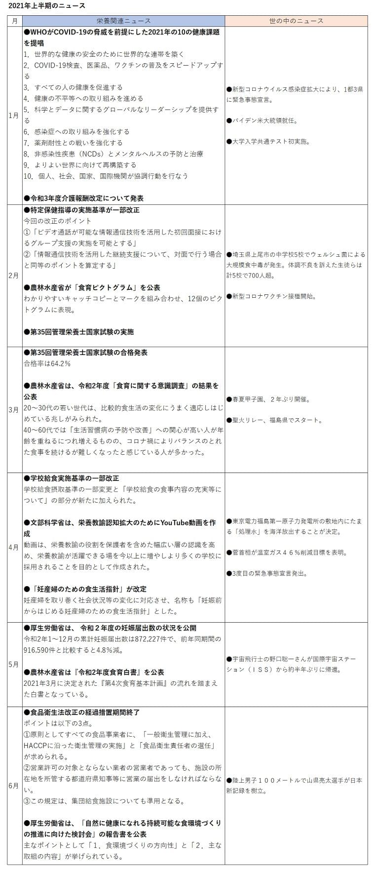 2021年上半期では、どんなニュースがあったのか、栄養関連の主なニュースをピックアップしました。世の中のニュースとあわせてご覧ください。
